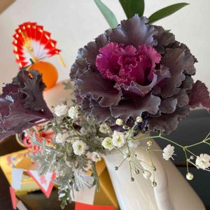 我が家で植木鉢で1年伸び続けた葉牡丹さん。 50センチ位の背丈となりましたが、本日✂️させていただき、鏡餅のお側へ。 薔薇のように華やか印象で、しばらく室内で楽しませていただきます。