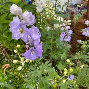 デルフィニュームの薄紫色、綺麗です☺️ 後ろにはホワイトもあります。 薄めの色は弱いのか、淡いグラデーションカラーのは株が弱くて咲きませんでした。