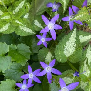 カンパニュラかな?切り株の下でラミウムと一緒に咲いてます☺️