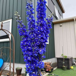 最近の雨と風で横倒しになってしまったので支えに縛りつけました。 でもちょっと自然に見えないので残念ー。 綺麗な青のデルフィニウムです。