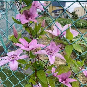 クレマチスのハーグレーハイブリット 畑用のみどりフェンスを隠したくて植えたけどまったく隠れず。 隣にジャックマニー植えたけど開花期がずれてるみたい😄 ハーグレーと同時期に咲く柔らかい色の新枝咲き探し中です☺️