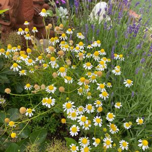 ジャーマンカモミール 線香花火みたいで可愛い😍 種が飛んで赤ちゃんも出てきてる✨
