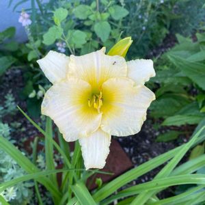ヘメロカリス一番花開花です😄 柔らかいイエロークリーム色が花壇を穏やかな雰囲気に見せてくれてます✨