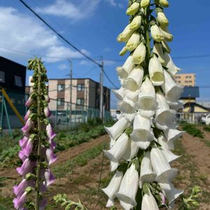 畑をバックに、ジギタリスホワイト。 ホワイトが一番好きです😄 ジギタリス増えすぎてしまって、ただいま希望者におすそ分け中。 ジギタリスが土を占領して植えたいものが植えられぬ、、。