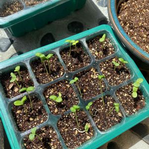 種まきしたジニア、発芽率高い上に一週間もしないうちに芽がでました。 かすみそう、千日紅も種まきしました😊