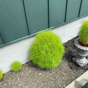 無機質な犬走、、に零れ種ねコキアが大きくなりました😄 ここは将来的にレンガで花壇にしてバラなどを植えてみたいのですが、いつになるかとやらです。 ガルバニウムの壁なのでトゲのあるバラはやめたほうが良いかしら。