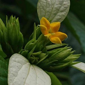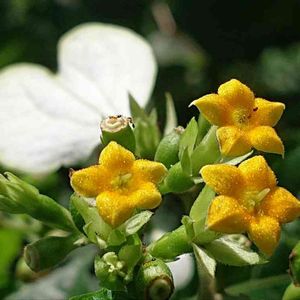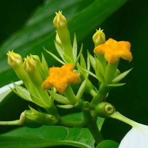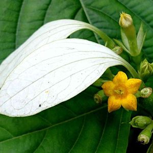 ヒロハコンロンカ アカネ科コンロンカ属 落葉 低木〜つる状木本 里山の林縁に生える 分布 本州(静岡県、紀伊半島)、四、九 成育地は高知県では東西にわかれる 🌸💐枝先に集散花序を出し黄色花を1個?❓咲かす 外側の花の萼片1個が長さ2〜3cmの白い花弁状になる 命名 牧野博士
