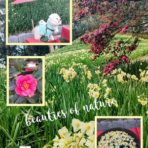 チューリップ🌷と噴水⛲️と🐶ちゃん 綺麗なお花に見とれているのかな꒰⑅•ᴗ•⑅꒱
