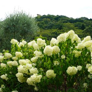 カシワバアジサイ、アナベルの季節も終わって ノリウツギ ミナヅキが咲き始めました ライムグリーンから白く変わっていく様はアナベルと似ています 娘のメイン花壇にはバラは植えてなくて 手のかからないオリーブやレモンユーカリ、アメリカテマリシモツケのグリーンと下草のホスタ、クリスマスローズがあり、アジサイが華を添えています