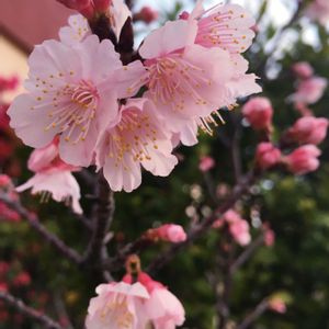 1月❷⓪【緋寒桜】*上原高台公園 梅.桜.梅の見分け方。 梅…花びらの先端が丸い。 桜…花びらの先端が先割れ。 桃…花びらの先端が尖っている。 三つとも、花が美しく実が食べられる。 🌱バラ科🌱サクラ属🌱 2020.1.19 am 9:51 🌤