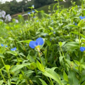 神社にある池のほとりで青いツユクサに出会えました🪷