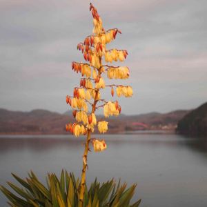 「水辺の水曜日」 寒い時期に、咲くのですね! アツバキミガヨラン(厚葉君が代蘭) ユリ目リュウゼツラン科ユッカ属の耐寒性常緑低木 葉は厚く頑丈な剣状で長さ60~80cmほどあり、葉先は鋭く尖り、折れ曲がらない。 開花期は春と秋の2度。 春咲く花は白、秋咲く花は淡紅色を帯びています。