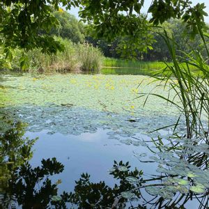 ソウルの森-45 池の中にアサザがたくさん咲いてるんですが、黄色い花見えますか?