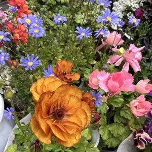 ①オレガノケントビューティー。 少しずつピンク🩷色に。 ②ラグラスバニーテール、ふわふわでかわい子ちゃんです。 ③④ラナンキュラスラックスグレースやアリアドネも咲いてきました。 ⑤パンジーをベロニカグレースや都忘れとバスケット🧺に。