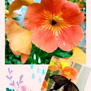 おはようございます🎶 今日のお花🌸ノウゼンカズラ💗 クロアゲハ⁉️と共に🤳 先月、実家の庭で(*´▽`)ノ