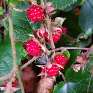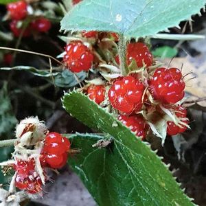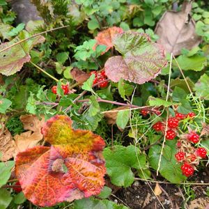 フユイチゴに実がなったので、小躍り中🎶2020年2月に道路脇に雑草化していたのを貰ってきて地植え(今年9月10日に花をUPしてます)。食べてみたら、酸味が勝つものの、みずみずしくて美味💕 Rubus buergeri バラ科キイチゴ属