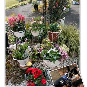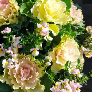 近所の花屋さんのハンギングです。 葉牡丹とネメシア🤍🩷💚 クリィミーな組み合わせで上品✨️ イエローパンビオで明るいハンギング💛🧡 我が家のサクランボの黃葉🍂 🍂毎日落ち葉掃きです🧹 ビオラ・バニーガール🐰 可愛いです💞