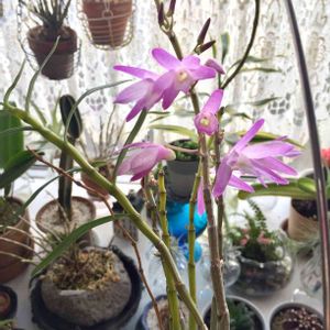 こんにちは😃☁️ 曇り空です。 桃花のセッコク 長生蘭 桃花 開花しました。 可憐に咲いて仄かに上品な良い香り。 去年育った手前の矢の方にも蕾が育って来ました。3月にもうひと花咲きそうです😆🌸🌸🌸🌸 そして根元には今年の新矢がピョコピョコ出て来ましたよ〜🎶 桃花が個体名なのかざっくり呼称なのか不明ですが、ラベルには桃花とありました。いわゆる石斛花物というジャンルの子なんでしょうね。 Dendrobium moniliforme (石斛の学名)