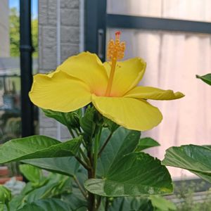 今朝のハイビスカス💛💛💛🥰 ガスボンベはお隣さん😁