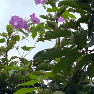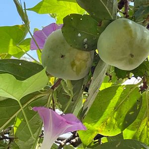 おはようございます(*´∀`)♪ 1本だけのアサガオ💗最初の花は椿の木を頼って咲いて来ました〜 グングン伸びて椿の葉っぱの中でも咲き もっともっと伸びて柿の木に登って咲いています😆🎶 朝顔やつるべ取られてもらひ水 (加賀千代女) 未熟柿で良かった〜笑笑 柿の葉は虫穴ばかりで…😂🤣 実りの秋が楽しみです😋 今日も穏やかな一日になりますように。。。