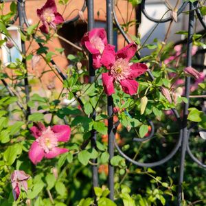 クレマチス アバンギャルド プリンスチャールズ アバンギャルドはちょっと見ていなかったら絡み合って大変、ビチセラは切れるから好き チャールズは蔓の間からにゃんこが侵入🐈つるを切って今回はポツポツ咲き