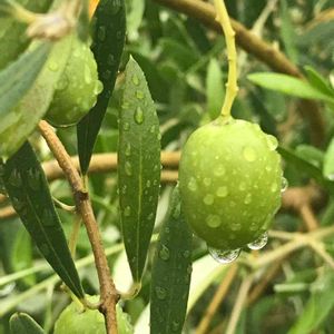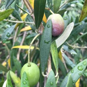 雨に濡れたオリーブの実🫒🫒🫒 新鮮に感じましたー👍😸 色づく?!まで落ちないでー!! 🫒💚🫒💚🫒🤎🫒💚🫒🤎