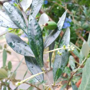 見、実、みえますか? 初めてオリーブの木に実がなりました。 10年くらい前からあるのに役立たずと思ってゴメンなさい🙏 蜜蜂くんありがとう🐝