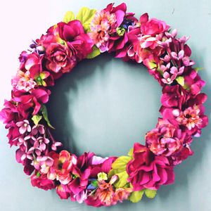 余った造花で作ったリース その2 どうも秋っぽい仕上がりになったけどアジサイをたくさん使ってるんですよ 丸く作るのが難しい💦