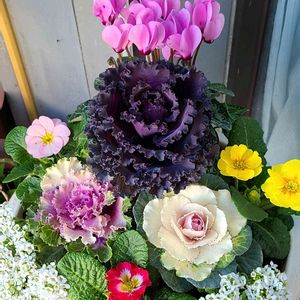 おはようございます。 今日は雨降ってます。 お正月前に寄せ植えた鉢 約2ヶ月。 プリムラジュリアンの花がら摘みました。 濃いビオラの花が、増えてきました。 長男の玄関の傘立ての前 今朝は、水やりしていません。 葉牡丹伸びてきました。