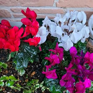 こんばんは😃🌃 今日のお花 シクラメン。 ハンギングに、寄せ植えたシクラメン3色。 鉢で、生き延びたリーフプミラを、移植し寄せ植えました。