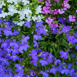 おはようございます。 少し離れた場所に吊られていた名もないロベリア3色。ブルーが、元気。 白とピンクも、頑張れ✊‼️ 向きを、変えながら育てています。 吊り30cm丸型ハンギングバスケットですが、高さ花台に、乗せています。 ゆったりしていたスペースも、埋まりました。