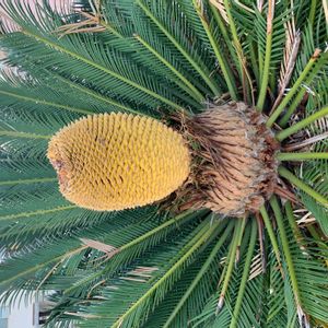 南国や海岸によく植えられているヤシやソテツ 千葉の館山や神奈川の葉山、 伊豆の海岸近くにもよく見られます 雌花、雄花、実も一緒に見られるのは珍しいです(〃∀〃)🏝♪ 実には毒もあるらしいので ワンチャンのお散歩にはご注意を🐕