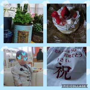 リメ缶にプテリスを植えたのと 今日は孫っちの1歳のお誕生日でした🎶🎵🎶 一升餅は母について貰って私は袋担当だったのでミシンでぬって文字を🖌️したりステンシルしたりしたよ💕 おもちもやっと背負って2歩くらい歩けたくらい😅 息子とお嫁ちゃんは写真館で写真とったり、お嫁ちゃんが作った孫っち用の🎂 ちょっぴり大人っぽい姿の孫っちでした✌️ 来月からは保育所に入所するけど・・・大丈夫かなぁ~⁉️