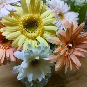 今日は結婚式に参列して、お花を頂いた 優しい色合いのガーベラとかすみ草 テーブル上が華やかに