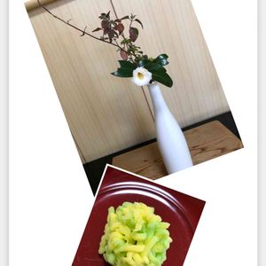 🍵のお稽古 お花 小ちゃな椿 ハーブ🌿 お菓子 菜の花