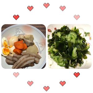 安曇野の魔女🧙♀️さん投稿のお料理 左 紅茶☕️で下煮した豚バラ肉柔らかい ✌️ 大根庭の畑産 右 地元群馬産🥒甘くて美味しい カニカマ買い忘れ生姜入れた😂 ワカメは鳴門ワカメ(夫の知り合いが 作ってる) 魔女さんupしでごめんなさい🙏
