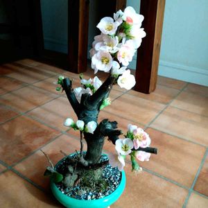 スーパーの入り口のお花屋さんからお迎えしました❁ 薄いピンクがかわいいボケの花。 満開になりました ٩(ˊᗜˋ*)و♪