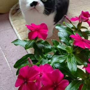 サンパチェンス&ごまちゃん😼 園芸店に 資材を買いに行ったらサービスで サンパチェンスをいただきました💠 夏は 水やりが 大変なので 一年草は お迎えしないようにしてたけど 『いらない』と言えなかったあるある😅