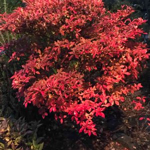 我が家の庭で一番の紅葉ドウダンツツジ! あえて夕方シャワーの水遣りをして待つこと10分。陽が落ちてライトアップすると、葉がより赤く光って見え、癒されます。