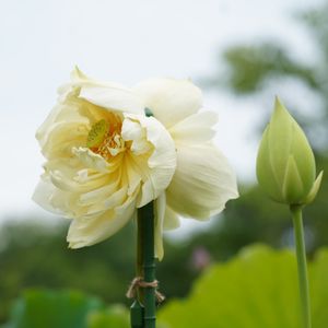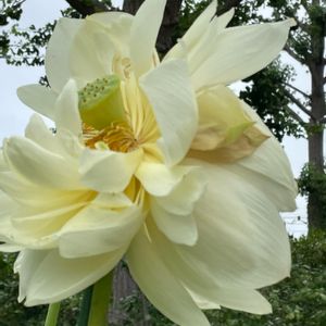 ハスの花 見てきました💓 双頭蓮 一昨年に初めて見れた時は一重咲きでピンク色でした🩷 今年は八重咲きで白色?クリーム色にも見えたかな 猛暑の中 綺麗に咲かれてました🤍(彦星 織り姫🎋) 大船フラワーセンターにて