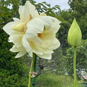 こんにちは♪ 🤍双頭蓮🤍 頭が重いので支柱に支えられてます