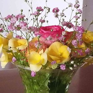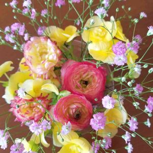 今朝の食卓花 次々咲くラナンキラス カスミソウ、ベゴニア♡
