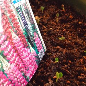 今月21日に気がついて 慌ててキッチンペーパーに蒔きました。 根が出て来たので土に植え替えました 大きくなるかしら? ルピナス♡