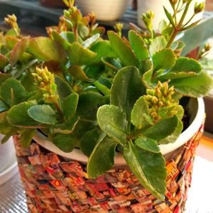 カランコエの蕾はまだまだ硬いね。 鉢カバーは9?歳の女性が編んだ物です