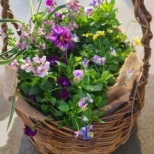 かごに植えてみした〰️🎵(^-^) 小論パンジーにミニミニビオラ💠好きな子詰めてみた🎵