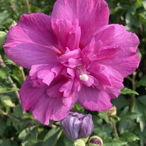 木槿 (ムクゲ) このクソ暑い中、咲き出しました😊 一重の方が先に蕾が膨らみだしたのに、八重の方が追い抜いてのGOAL❗🎊 まぁ、一重も時間の問題かな?