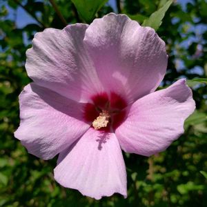 木槿(ムクゲ) アオイ科フヨウ属の落葉低木。中国原産で古い時代に渡来し各地で栽培される。庭木として植えられるほか、汚れた空気に強く丈夫なので街路樹としても植えられる。枝は上方へ直線的に伸びる独特の樹形。葉は卵形で浅く3裂し柄は短い。花期は7~9月、夏から秋まで次々と咲く。朝開き夕方しぼむ一日花だが、中には2~3日咲くものもある。花は同属のハイビスカスに似て南国の雰囲気がある。江戸時代からたくさんの園芸品種が育成され、花弁が5枚、半八重咲き、八重咲きなどがある。花色は白、淡紅色、中心に紫紅色が入った白など様々。中心の紫紅色は蜜のありかを示す蜜標識。昼行性の蛾が蜜を吸い花粉を運ぶ。果実は朔果。径1.5~2㎝の卵形で、秋に熟して乾くと5裂し、長い綿毛がある種子が出る。この毛で風にのって遠くまで運ばれる。 名前は、中国名の『木槿』を『もくきん』と音読みしたものが変化したもの、あるいは韓国名の『無窮花(ムグンファ)』を『ムキュウカ』と音読みしたものが変化したともいわれる。 出典『樹木の事典600種』『樹木の名前』『里山の花木 ガイドブック』