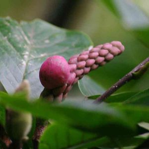 ★ 食べて遠くへ運んでシリーズ ハクモクレン 白木蓮 モクレン科 モクレン属(マグノリア属)の落葉小高木 桜に先立って 3月~4月初め頃、 真っ白で 大きく 厚いけど しっとり軟らかな花びらが 上向きに 咲きます。 泰山木に並ぶ 大好きなお花です。 去年 GS を始めた頃には 咲き終わっていたので 今春が 待ち遠しくて仕方ありません。 お花は 大好きですが 実の事は知りませんでした。 気になって 秋に 探しに行ったのですが、この ひとつだけしか 見当たりません。 調べてみると、5月頃には結実し ( 袋果の集合体 5~10cmの棒状 ) 風で揺れると ポロッと落ちるのだそうです。 なるほどね。 みんな、私が気付かない間に 落っこちちゃっていたのね~ 数本だけ 落ちずに残っている実は、写真で分かるように 一部が腫れて来て(=袋果) 9月~10月頃 赤く色づきます。 袋果が 裂けると 朱色の丸い実が出て来ます。 写真は まだ 裂けていませんね。 実は 1cm程の大きさで 袋が 裂けたら落っこちてしまうのかと 思いきや 白い糸(=珠柄 ) で 吊り下がってるのだそうです。 この後 もう1度 観察に行ってみたのですが、残念… 実はなくなっていました。 続きも 見たかったなぁ。また 秋まで お楽しみは とっておきましょうね。 撮影 2019年 9月末