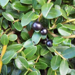 ★ 食べて遠くへ運んでシリーズ イヌツゲ 犬黄楊 モチノキ科 モチノキ属の常緑樹 雌雄異株 こちらもモチノキ属の お仲間です。赤い実が主流の モチノキ科ですが 珍しく コレは 黒い実なんです。 お正月 夫の実家で 過ごしました。今まで 気に留めなかった 庭木の事を 知りたくなって 聞いてみました。 「おかーさん、お勝手口の所に植えてある 丸く剪定している 木は なーに?」 「ツゲや。 門塀の上にも 並んどるやろ 庭にも あろう。じぃちゃんが 丸く剪定しとったは 全部 ツゲや」 へ~ ツゲなんだ。 帰宅して ツゲの特徴って どんなんだろうって 調べてみたら … アレレ?!?! おかーさん 違うじゃん コレは イヌツゲ けらケラけら とてもよく似た樹木ですが、まず、お仲間じゃない! ツゲは ツゲ科ツゲ属、 イヌツゲはモチノキ科モチノキ属 はて? どうしたものか。 おかーさんに 真実を 伝えるべきか、黙って ツゲだと 思わせておくべきか。 ぷぷぷ 撮影 2020年 1/2 スマホ撮影 ※ 追記 ターちゃんさんが お花の写真を 持ってらっしゃると お聞きして、ぜひ投稿してと、お願いしました。 みなさーん お花もご覧下さい!