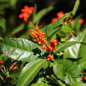 ★ 食べて遠くへ運んでシリーズ センリョウ 千両 別名 クササンゴ 草珊瑚 センリョウ科センリョウ属の常緑小低木 おっと! 一昨日からの 流れで来たら コチラも お仲間かと 思いきや、 科も属も 違うんですね。 縁起物 括りでは お仲間なのになぁ~ おもしろーい! ヒトリシズカやフタリシズカのお仲間なんですって! なるほどねぇ~ あの二人静かぁ それは さておき。 6月~7月頃に新梢の先に穂のように付けた 淡黄緑色のちっちゃなお花を咲かせるそうです。 花びらがなく黄緑色の雌しべに白い米粒のような雄しべが付いて、雄しべの一部が破れてくると黄色に変わっていくって ところが 特徴だとか。 お花は とても 地味で目立たないと Google先生は仰ってました。 それに引き換え、葉っぱの上に 乗っかった 赤い実は よーく目立ちますね。 撮影 2019年 12月 初め